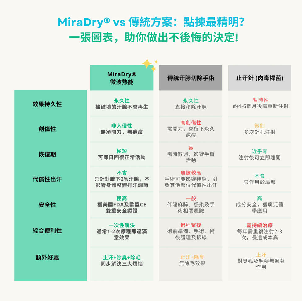 MiraDry Fresh 採用美國 FDA 認可的非侵入性微波熱能技術,全球超過300,000人次真實見證,透過專利系統將能量精準聚焦於腋下大、小汗腺分佈區域,徹底破壞產生汗水與異味的根源。整個療程僅需表層麻醉,無需動刀、無創口,安全性高、風險極低。